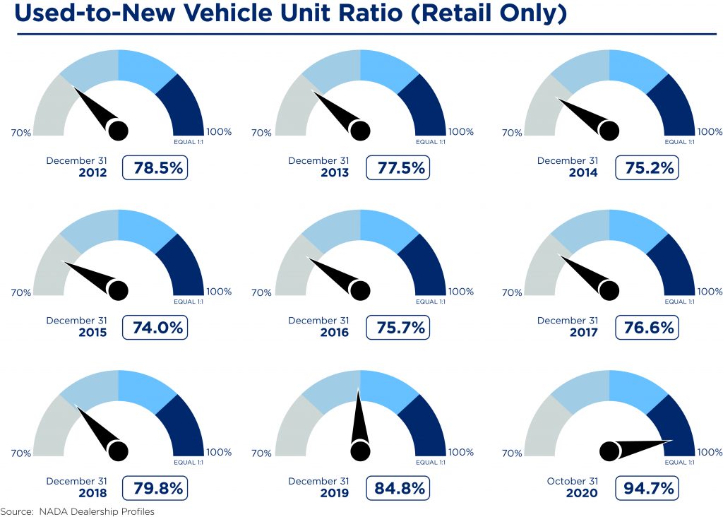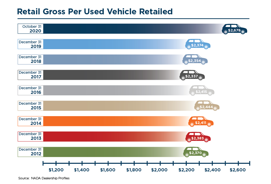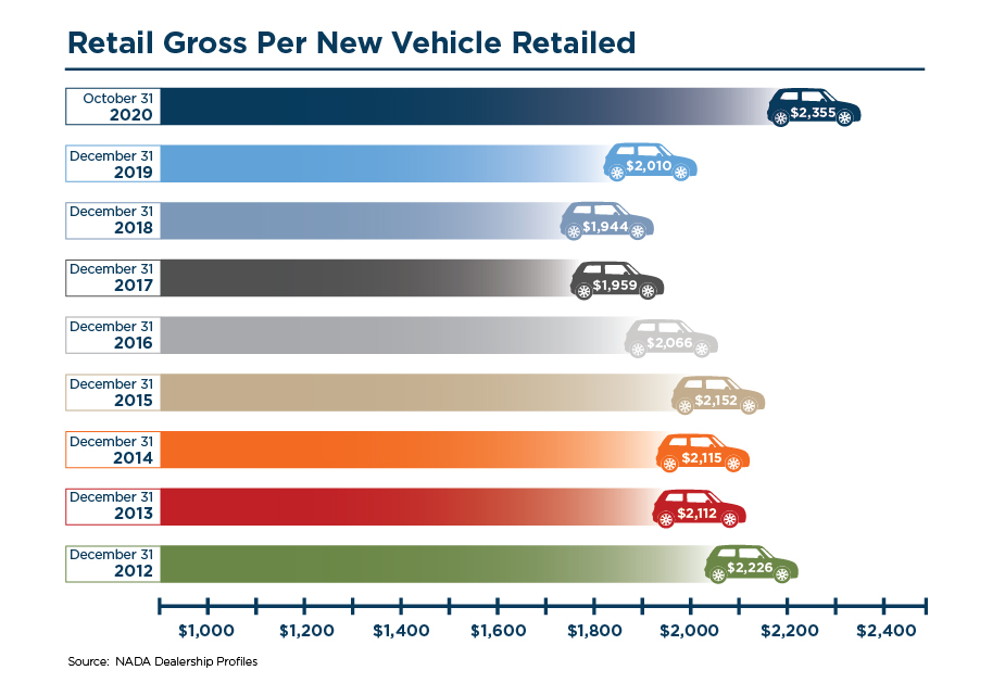 In a strange year of oddities, 2020 has all of us constantly evaluating life’s basic truths. Market conditions vary drastically across all industries and even geographically within the same industry due to local government restrictions. It’s critical for auto dealers to continually analyze all aspects of their business and be ready to capitalize on industry trends. We previously discussed the use of the NADA dealership profiles as a useful tool to examine timely monthly data based on averages or dealership type. Three specific metrics in the data have reached their highest level since the data was originally published in 2012: new vehicle retail gross profit per unit, used vehicle retail gross profit per unit, and used-to-new vehicle unit ratio.