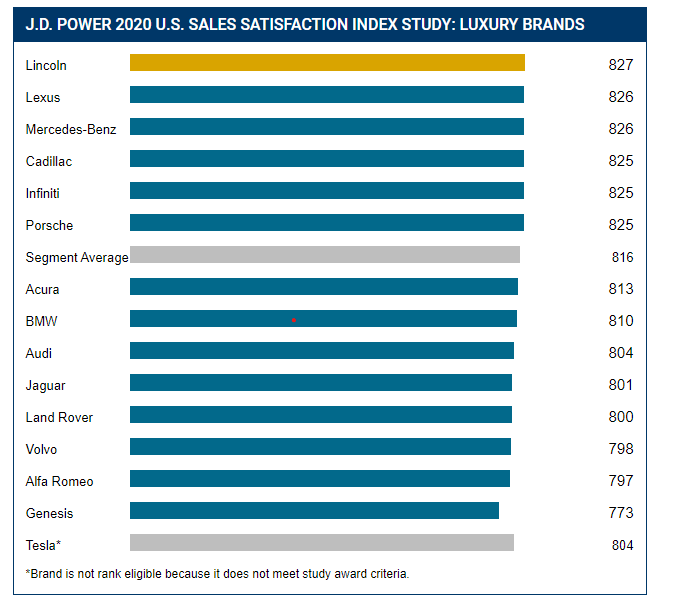 In addition to transaction volume, profitability, and blue sky multiples, the Customer Service Index (CSI) and Sales Satisfaction Index (SSI) results provide another lens when considering auto dealership valuations. J.D. Power recently released its 2020 SSI report. The results for Luxury Brands are displayed below.