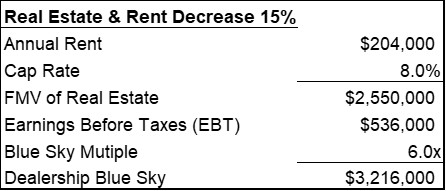 Based on the assumptions above, the dealership operations would have a value of $3,000,000 (EBT of $500,000 times a Blue Sky multiple of 6x) and the real estate would have a value of $3,000,000 for a total acquisition value of $6,000,000 as seen below.