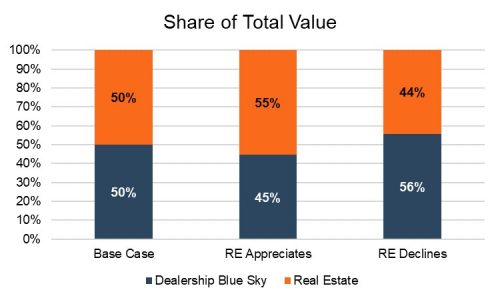 Why would dealers want to shift value and/or rental income to the real estate entity?  Let’s examine this through an example highlighting increasing real estate values and one highlighting decreasing real estate values.