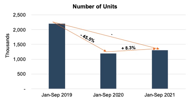 The graphic below depicts total fleet sales from January through September for 2019, 2020, and 2021 as reported by Cox Automotive. While total fleet units are up slightly in 2021 from the same period in 2020, this figure is misleading when viewed in the context of more normal fleet sales in 2019. In fact, current year-to-date fleet sales are down nearly 41% over 2019 figures.