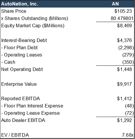 Many noted increasing valuations, and an analyst on the AutoNation call mentioned his M&A modeling at about 15% to 30% of sales.  CFOs for multiple companies noted their focus on EBITDA multiples when doing deals, which are highlighted in theme #4.  For perspective, the market ascribes about a 7.7x EV/EBITDA multiple for AutoNation with floor-plan interest treated as an operating expense as calculated below: