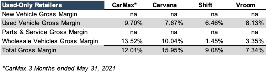 For total gross margin, however, the impact of fixed operations is clear. Blended total gross margin for traditional franchised auto dealers is approximately 15-18%. For used-only retailers, used and total gross margins are much lower as seen below.