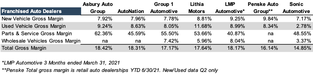 Parts and service departments have higher margins than vehicle sales departments, and these departments account for a significant portion of gross profit for auto dealers. According to NADA, through the first half of 2021, gross profit contribution from parts and service was considerably lower than historical levels (37.4% of total gross profit), but it still outpaced that of both new and used vehicle departments despite making up a much lower percentage of revenue. Below, we have calculated gross margins in 2021 for the public auto dealers.