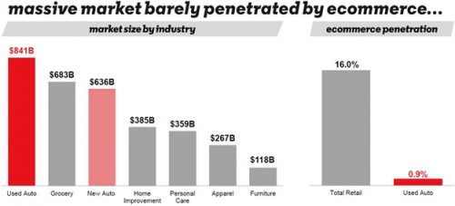 Vroom’s 2020 investor deck highlighted used auto as one of the largest markets at $840B trailed by grocery ($683B) and new auto ($636B). Using these figures (which are pre-pandemic), used-only players are limited to ~57% of the market.