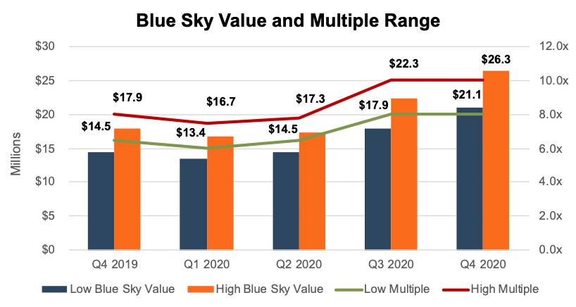 Without any context on the reported multiples (the red and green lines above), one might think that values were stagnant in Q4. However, the multiples reported by Haig are now being applied to 3-year average earnings instead of 2019 earnings. For the average luxury dealership, 2019 pre-tax earnings were $2.2 million, which were below 2018. Factoring in the higher earnings of $3.4 million in 2020, the 3-year average is $2.6 million. So, as seen on the graph, a dealership on the top end of the range saw their value increase by approximately $4 million as higher earnings are applied to multiples that held firm.