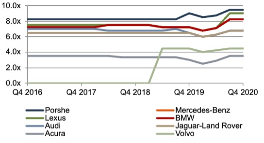 Mid-Line Imports multiples also followed the overall trend, as only VW’s Q4 wasn’t higher in 2020 than 2019 (each 3.0x – 4.0x). Nissan’s Blue Sky multiple in Q1 2020 declined to a paltry 1.5x on the low end, the lowest ever reported by Haig for any brand dating back to 2013. This was driven by troubles that began before the pandemic as corporate turmoil and an aging lineup weighed on dealer profits. At Q4 2020, this had rebounded to 3.0x – 4.0x, the highest for the brand since Q2 2018. Dealers that held on during the last few years have been rewarded. As noted previously, at the top end of mid-line imports, Toyota snuck its nose ahead of Honda, to pace the segment at 6.25x – 7.25x, on par with Jaguar/Land-Rover and Audi. Q2 and Q4 2020 were the only two quarters on record in which Toyota dealers have outpaced Honda, albeit only at a quarter turn multiple difference. Meanwhile, Subaru has caught up to Honda at 6.0x – 7.0x, a gap that has steadily narrowed since Subaru was closer to a 4.0x-5.0x multiple in 2016.