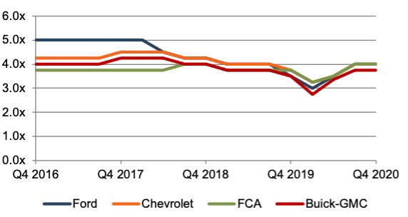 Dealers will likely need to ramp back up staffing levels and advertising to support sales, but strong demand relative to constrained supply has led to higher gross profits for dealers. While dealers are optimistic that the cost savings will be “sticky,” we note ten years of slow, consistent growth since the Great Recession led dealers to such an environment where there were excesses that could be cut out of the cost structure. We see earnings and sales levels normalizing which only bolsters the need to consider earnings in a multi-period context.