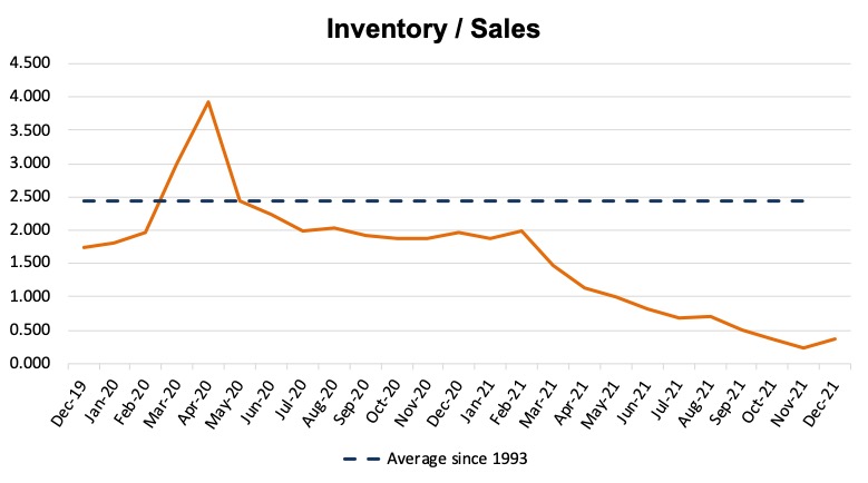 Reported beginning-of-month January inventory balances remained low but showed a marginal improvement from last month. Improvements aside, the industry’s inventory to sales ratio remained well below its long-run average of 2.45x, emphasizing the fact that supply chain and production recoveries still have a long way to go.