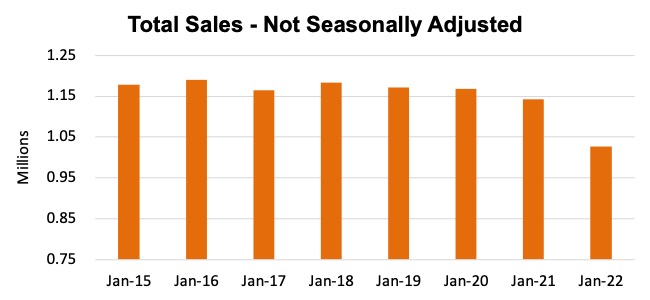 SAAR reached a seven month high in January, totaling 15.0 million units on an annualized basis. SAAR was up 20.0% from last month but down 10.4% from January 2021. While the SAAR certainly improved, raw sales volume in January was the lowest since April 2020. January is typically the lowest selling month for dealers each year, so the seasonally adjusted nature of the metric can make it difficult to compare with other months; it puts a lot of faith in the math required to annualize sales. The bar chart below shows raw sales numbers in January 2022 compared with raw numbers in January since 2015.