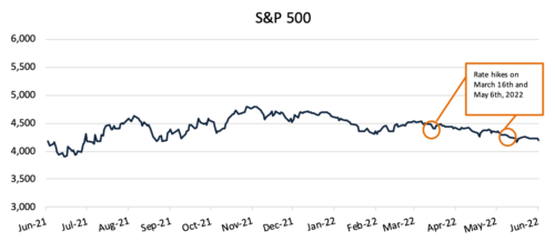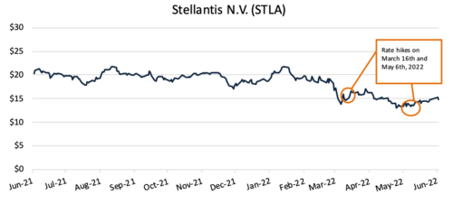 With the Big 3 committed to significant EV investments over the next five years, there is increased execution risk with delivering vehicles that fulfill the promise of EVs that benefit consumers without representing a trade-off between fuel efficiency and performance. To the extent these investments are financed by debt, the rising cost of financing may drag on profitability. Pushing returns further out into the future also tends to reduce valuations as interest rates rise, as seen in the decline in tech stocks. While the stock price of a public company is subject to exogenous forces outside of the realm of what may impact the valuations of closely-held businesses, the private markets ultimately are impacted by the public markets. See the charts below for a look into the stock prices of Ford, Stellantis, and GM compared to the timing of rate hikes by the Federal Reserve in 2022: