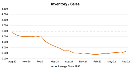 On the supply side of the vehicle sales equation, inventories have remained low but seem to be marginally improving. The industry inventory to sales (“I/S”) ratio was 0.67x in August, the most recently available month of data. August’s I/S ratio compares to 0.51x in July and an average of 0.47x from January 2022 to July 2022. For the remainder of the year, we expect industry-wide inventory levels to slowly improve. However, it is unclear how long auto manufacturers will take to bring the industry I/S ratio up to the long-run average of 2.4x. As this recovery unfolds, it will be important to keep an eye on efforts to bring more domestic semiconductor facilities online, the ongoing status of the war in eastern Europe, and the availability of key inputs from Asian markets like China. These underlying factors are key levers that would allow the domestic production of vehicles to improve in a meaningful way.