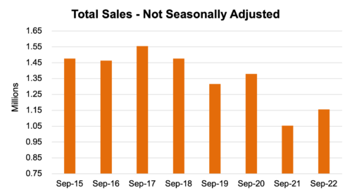 Looking at unadjusted sales numbers, September 2022 also showed a real improvement from this time last year. While this month’s unadjusted sales (1.16 million units) were certainly still limited by supply-side inventory issues and much lower than sales levels observed from 2015-2020, it is clear that September 2021 (1.05 million units) was a low point that makes the last month look good by comparison. See the chart below for unadjusted sales numbers from the previous eight September releases:
