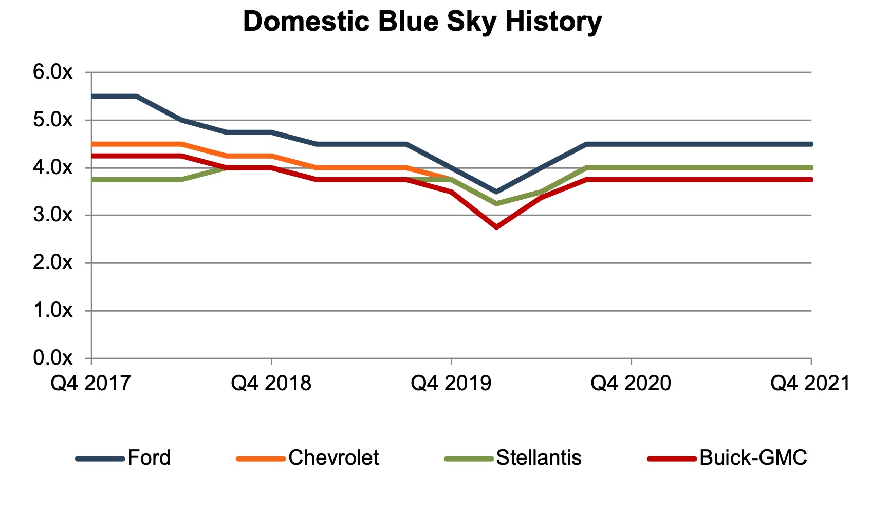 Pre-COVID and chip shortage, it would be no surprise if Blue Sky multiples remained stable over numerous quarters for many brands. As seen in the charts later in this post, multiples normally don’t tend to shift dramatically on a quarterly basis. Multiples are dependent on numerous factors, though brand desirability is chief among them. This is usually tied to product lineup and the overall effectiveness of the OEM.