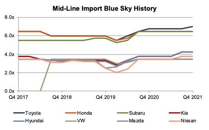 Domestic franchise multiples have not changed in the past year, all generally above the lackluster mid-line imports but well below other players. One would think that supply chain constraints would negatively impact import brands more than their domestic counterparts. However, the past year has demonstrated that even domestic brands rely heavily on the global supply chain for their inputs, particularly microchips.