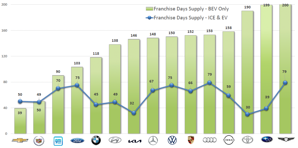 Other than Chevrolet and Cadillac, EVs’ average days’ supply and inventory levels are higher than traditional ICE vehicles for all other manufacturers listed above. Dealers have plenty of EV inventory on their lots, but the pricier EV models are not selling as quickly and are beginning to pile up.