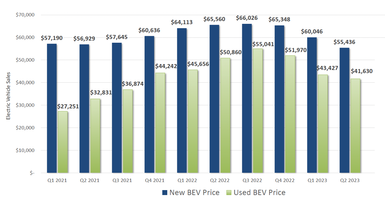 The following graph from information provided by Cox Automotive details the average new and used price trends from battery electric vehicles (BEVs):