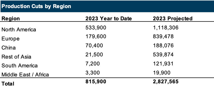 The following table compares 2023 year-to-date production cuts by region with the total 2023 projected production cuts, per AutoForecast Solutions, Inc (“AFS”).