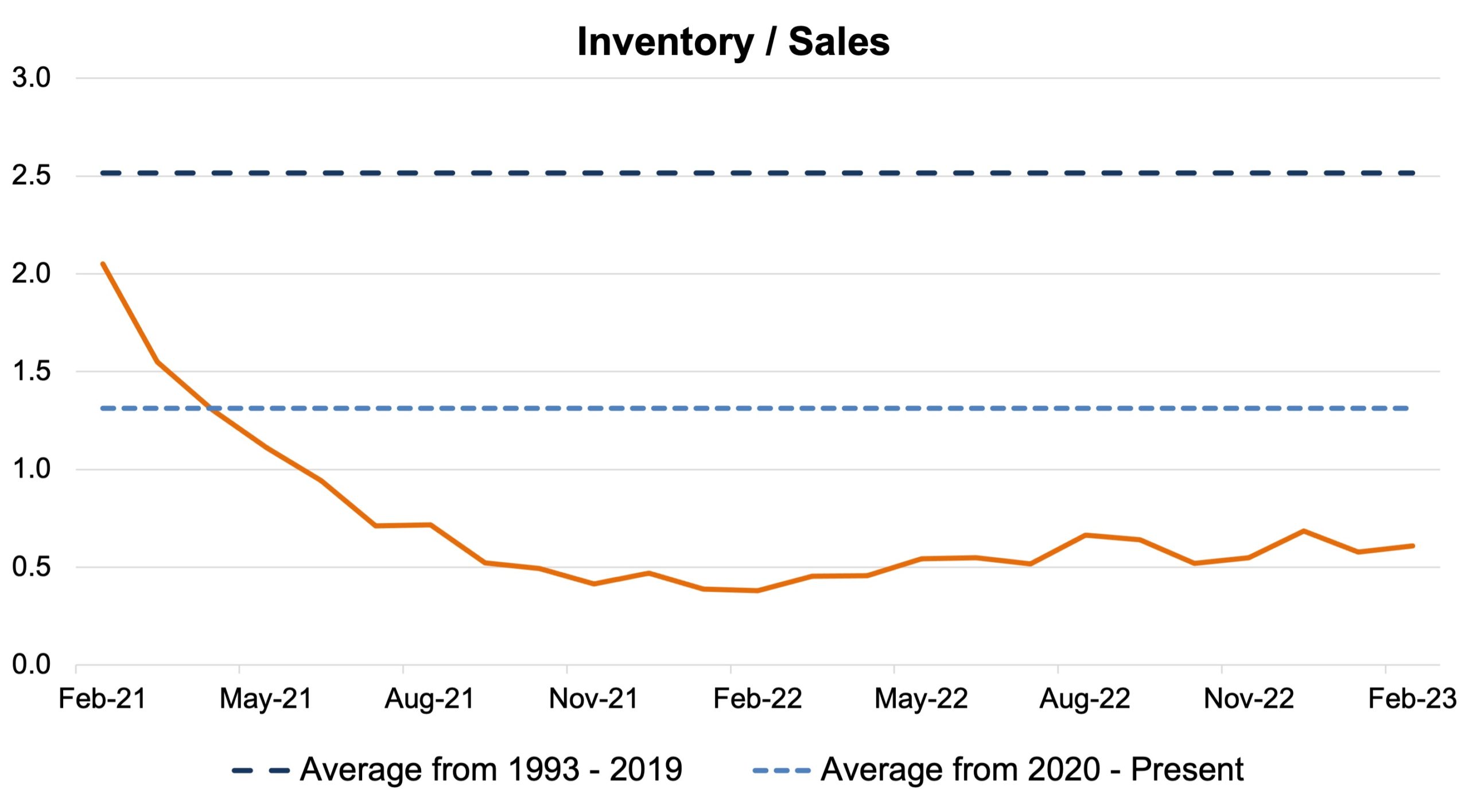 The industry’s inventory-to-sales ratio kept with the trends of the last few months. While we are seeing marginal improvements over the last several months compared to the first half of 2022, the ratio is still below the long run pre-COVID average of roughly 2.5x and the post-COVID average of roughly 1.3x. This month also marks two years since the ratio began its nosedive (as is shown in the chart below).