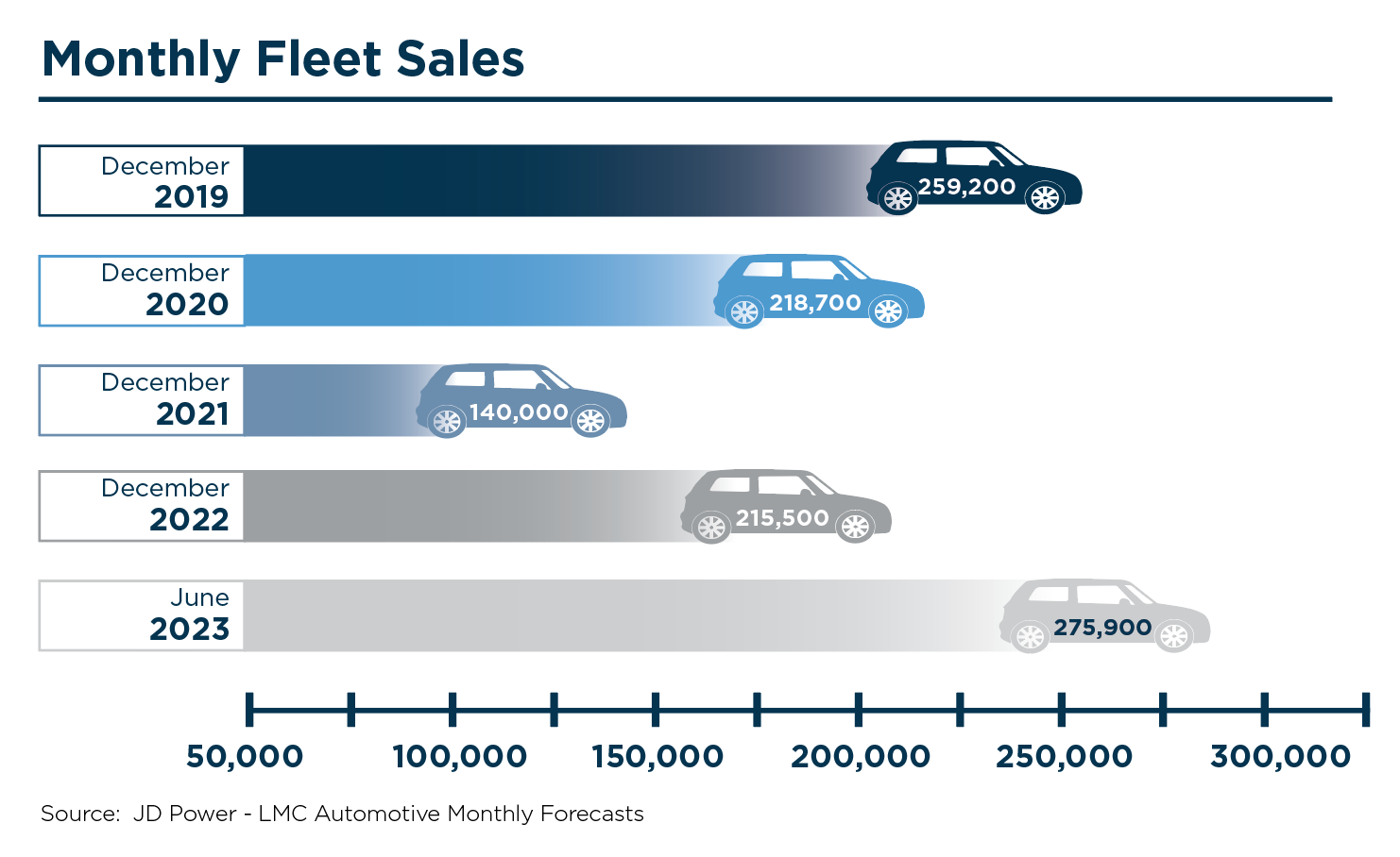During the height of the pandemic, fleet sales declined significantly. Rental car companies weren’t just canceling orders; they actively sold off their existing fleet to build up cash as cities endured temporary shutdowns and much of domestic travel was halted or significantly curbed. With travel returning and inventory supply improving, fleet sales are also steadily increasing. As seen in the graphic below, monthly fleet sales for June 2023 are estimated to be 275,900 units, the highest in the figures measured in the graph below: