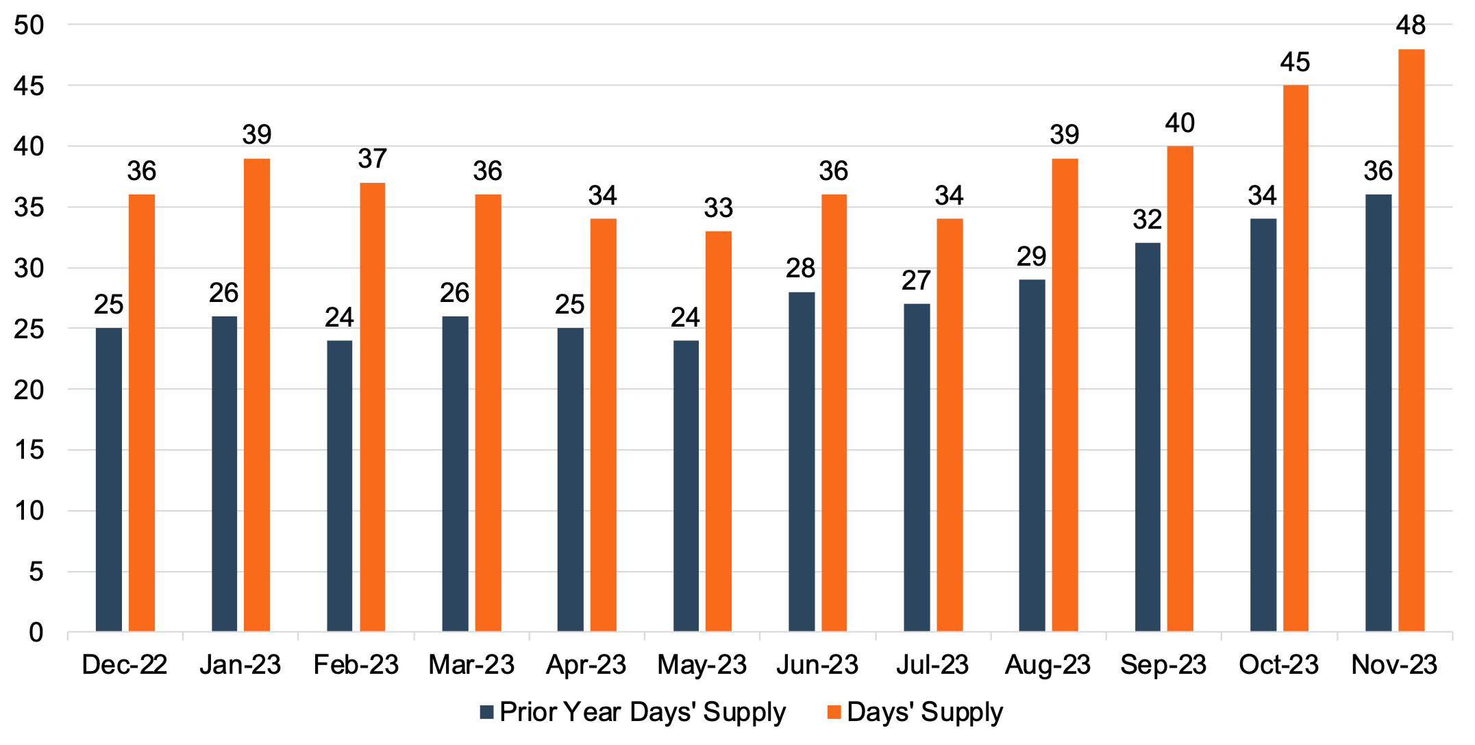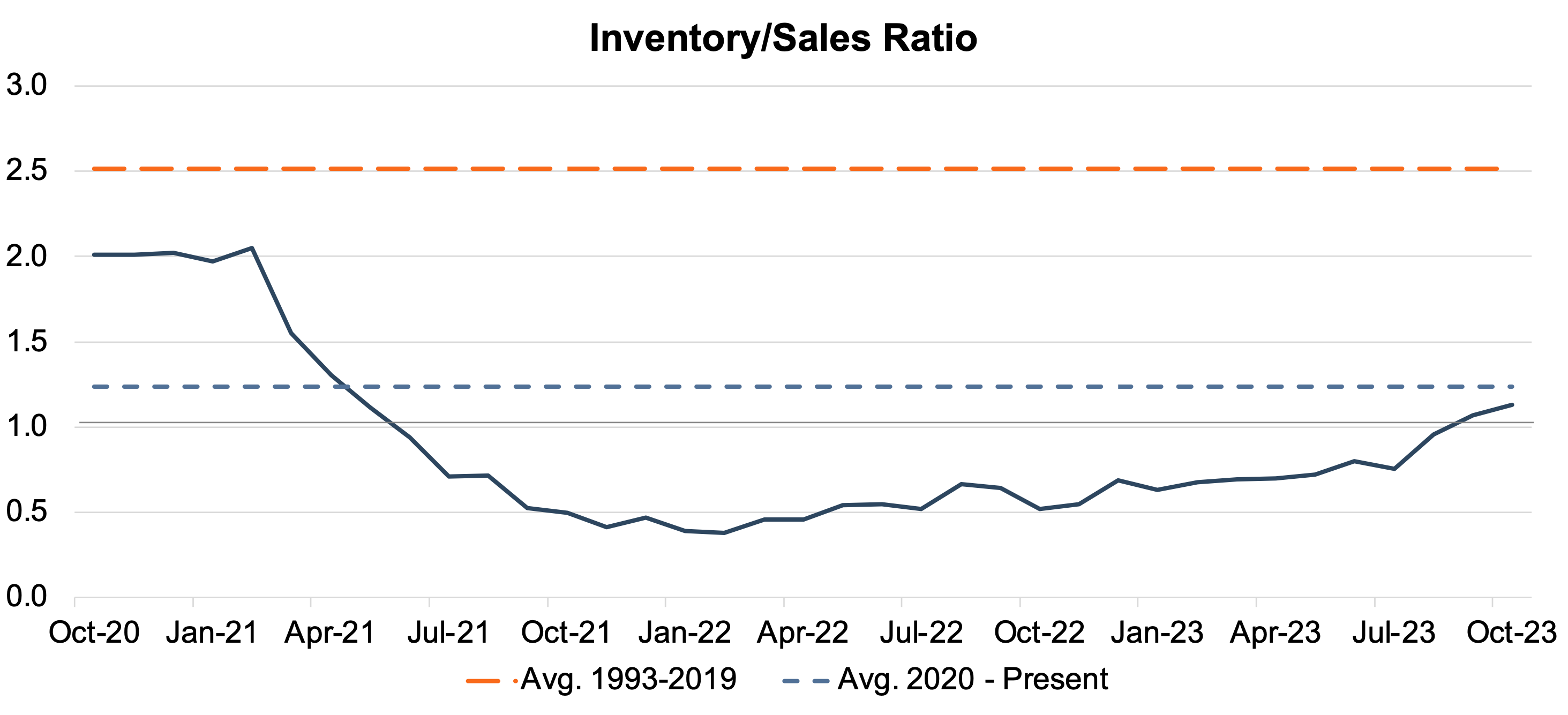 In recent months, the industry’s inventory-to-sales ratio crossed the 1.0x threshold. October 2023 data marks the second time the ratio has been above 1.0x since May 2021, nearly two and a half years ago. For perspective, an inventory-to-sales ratio greater than 1.0x indicates that the seasonally adjusted inventory level at the end of the month was greater than reported sales. The October ratio of 1.13x signifies an expansion in nationwide inventory, contrasting with the suppressed inventory levels seen over the past few years. The chart below illustrates the industry’s inventory-to-sales ratio over the last three years.