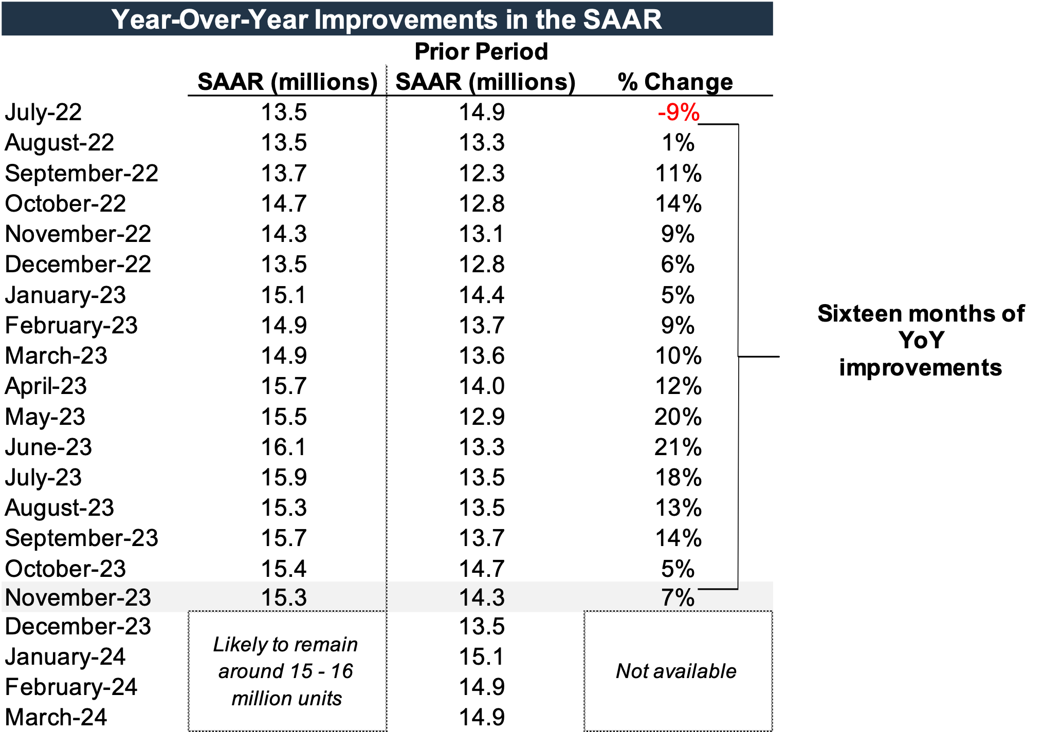 Despite slowing growth, year-over-year improvement in the November SAAR extended the streak of consecutive year-over-year improvements to 16 months. Going forward, we expect this growth streak to extend through December 2023 and potentially through March 2024. January 2024 is the most likely month in which the streak could be broken during this time period. See the table below for a look at the last sixteen months of year-over-year improvements and the next four months of anticipated improvements.