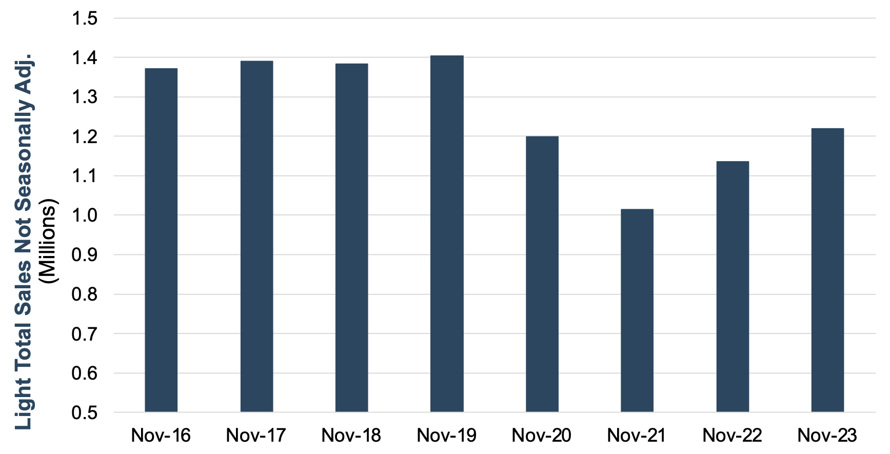 On an unadjusted basis, the industry sold 1.22 million total units last month, marking the highest level of November sales since 2019 and bringing the 2023 total to 14.0 million units. As December is typically the highest-selling month for auto dealers, total sales will likely creep up over 15.5 million for 2023. Settling around 15.5 million units would compare favorably to last year’s 14.2 million units and 2021’s 15.4 million units.