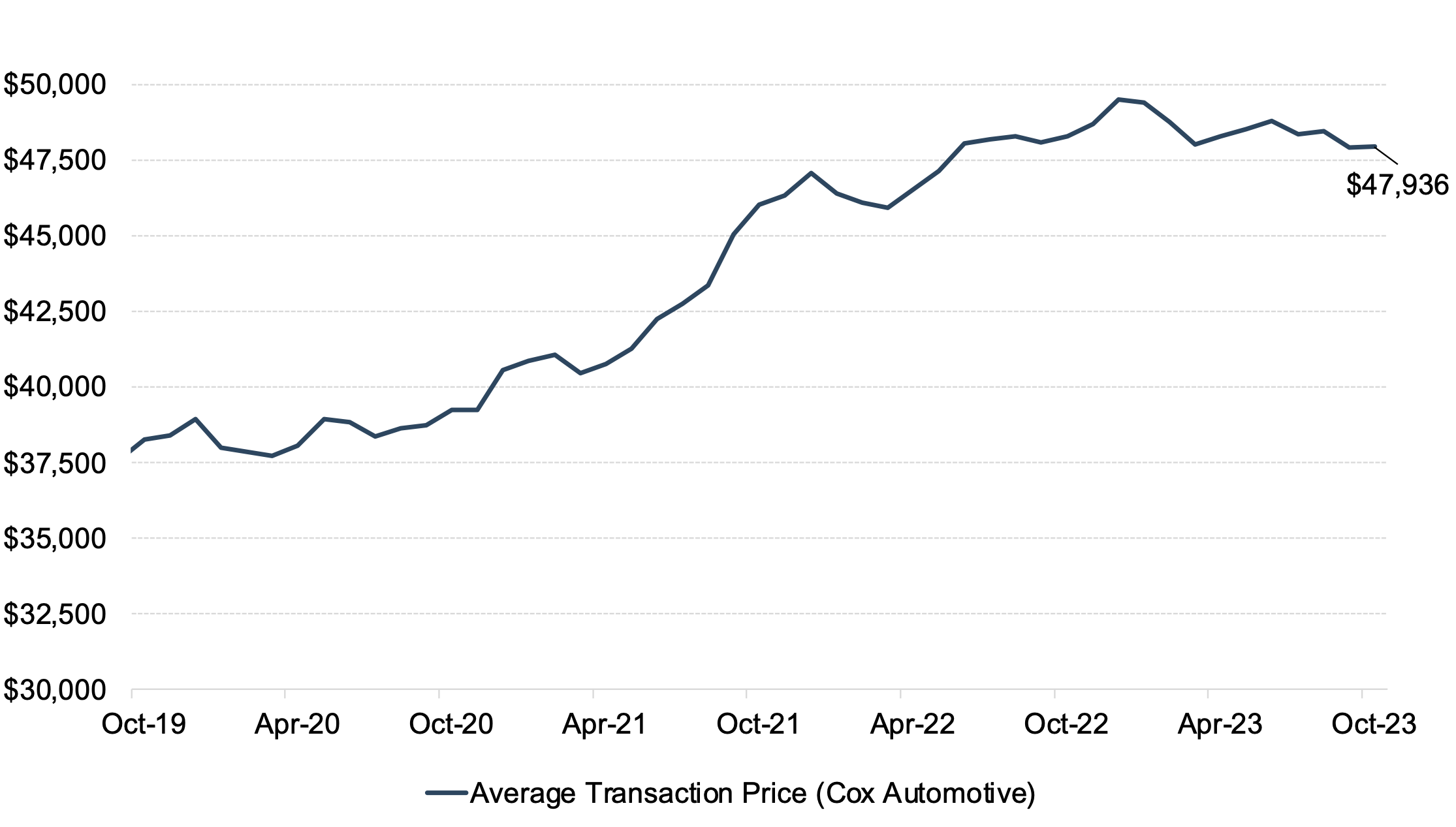 Increased supply across all models and a shifting vehicle mix are modestly dragging down the average transaction price. The chart below provides context around the monthly average transaction price (per Cox Automotive) from October 2019 to October 2023.