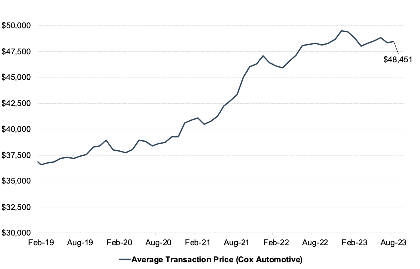 Increased supply across all models and a shifting vehicle mix are modestly dragging down the average transaction price. Persistent economy-wide inflation and the ongoing UAW strike are factors that could turn pricing momentum in the other direction. See the chart below for context around the monthly average transaction price from March 2019 to September 2023.