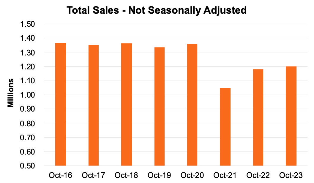 On an unadjusted basis, the industry sold 1.20 million total units last month, marking the highest level of October sales since 2020 and bringing the 2023 total to 12.8 million units. Total sales of 15.5 - 16 million units seem almost inevitable at this point, especially considering that December is typically the highest-selling month of the year. Just under 16 million units would compare favorably to last year’s 14.2 million units and 2021’s 15.4 million units.