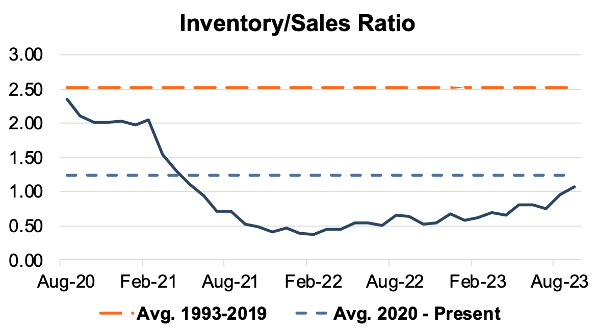 We have seen signs of recovery in the industry inventory-to-sales ratio for quite some time now. As a result of this steady recovery, the most recent September 2023 data marks the first time the ratio has been above 1.0x since May 2021, almost two and a half years ago. For perspective, an inventory-to-sales ratio in excess of 1.0x means that the seasonally adjusted inventory level at the end of the month was greater than reported sales in that month. This implies an expansion in nationwide inventory during September, as opposed to the inventory stagnation or drawing-down we have seen over the past two and a half years. See the chart below for a look at the industry’s inventory-to-sales ratio over the last three years.