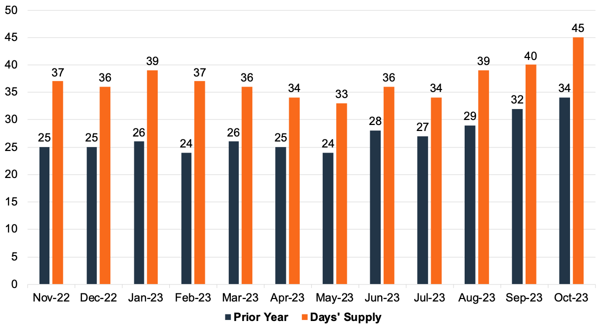Another way to view the relationship between auto sales and inventory balances is through Days’ Supply, which has steadily increased over the past year. A Days’ Supply of 45 in October 2023 marks the highest level of Day’s Supply reported by Ward’s Intelligence in recent memory. See the chart below for a close look at Days’ Supply for the entire industry over the past year (per Wards Intelligence):