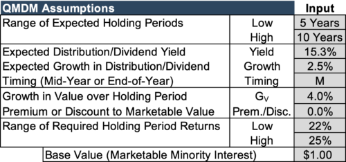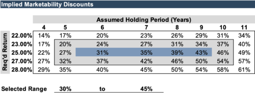 Our DLOM analysis typically considers the Quantitative Marketability Discount Method (“QMDM”). Using some reasonable assumptions (see the assumptions table below) and the case outlined above, the range of marketability discounts might be 5-20%.