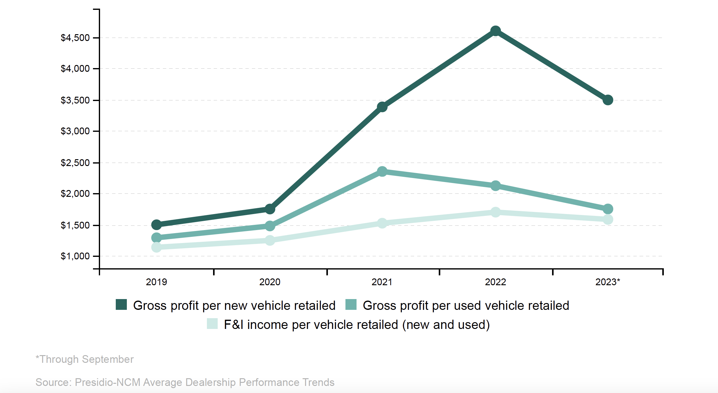 These trends began to soften and revert during the second half of 2023. Automotive News recently released third-quarter 2023 data illustrating that dealership pre-tax profits declined by approximately 20% compared to 2022. Further, gross profit margins for the first nine months of 2023 also declined by nearly 24% for the new vehicle, used vehicle, and finance and insurance (F&I) departments, as illustrated in the graph below.
