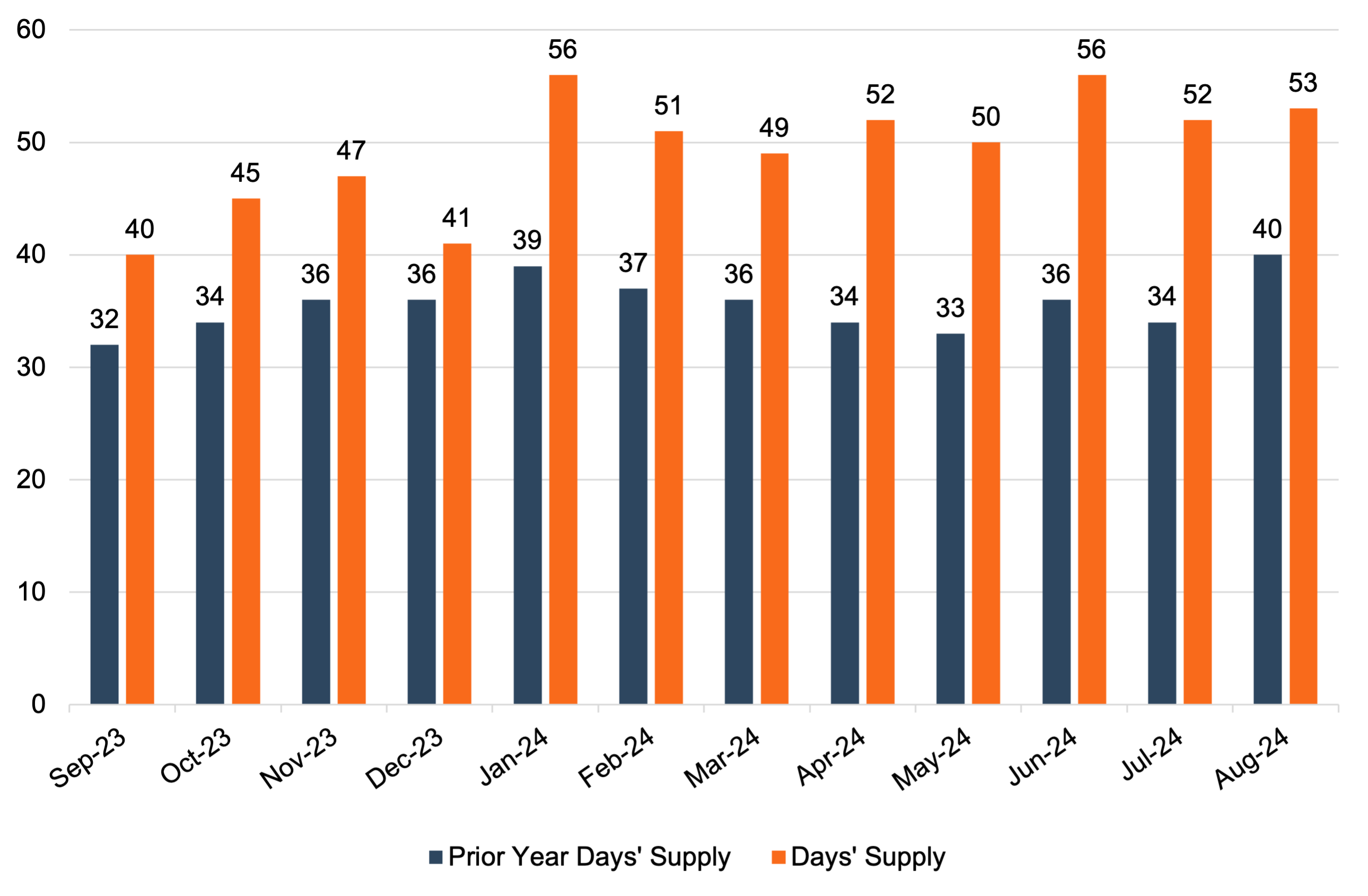 Days’ Supply came in at 53 days in August 2024. While this is certainly higher than the same time last year and reflects a recovery in the manufacturing supply chain at a global level, this measure of average inventory availability obscures the large differences in Days’ Supply by brand. For example, Toyota has been reported to have a days' supply below 20 days, while Stellantis is reported to have a supply of nearly 100 days or more.