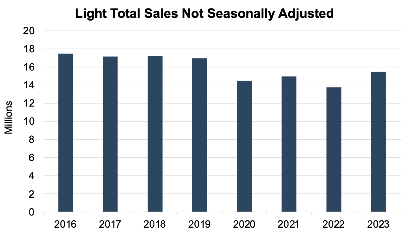 On an unadjusted basis, the industry sold 1.43 million total units last month, marking the highest level of December sales since 2020. The 2023 unadjusted total comes in at 15.5 million units, outpacing last year’s 13.8 million units and 2021’s 14.9 million units. For the last four years, depressed inventory, elevated interest rates, and heightened inflationary pressures have impeded industry sales. While unadjusted industry sales have remained well below pre-pandemic levels, 2023 proved to be a year of recovery, finishing the year just shy of 16 million units. The chart below presents unadjusted total sales volumes for the last eight years: