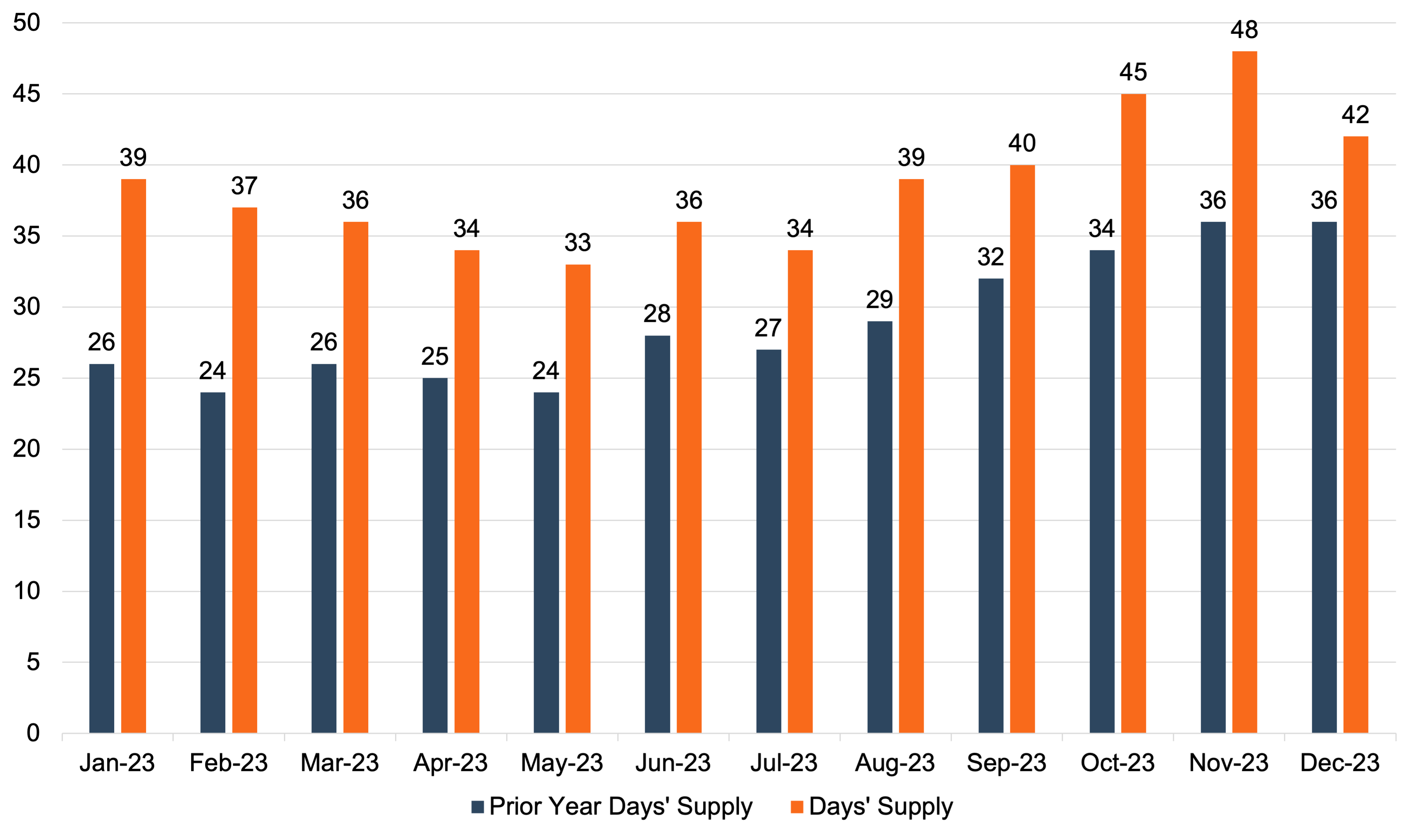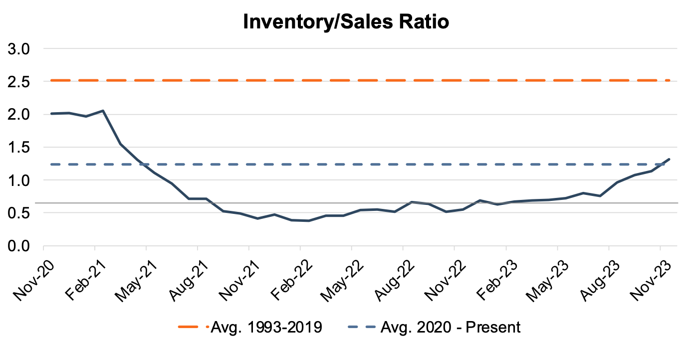 In recent months, the industry’s inventory-to-sales ratio crossed the 1.0x threshold. November 2023 data marks the third time the ratio has been above 1.0x since May 2021. For perspective, an inventory-to-sales ratio greater than 1.0x indicates that the seasonally adjusted inventory level at the end of the month was greater than reported sales. The November ratio of 1.31x signifies an expansion in nationwide inventory, contrasting with the suppressed inventory levels seen over the past few years. The chart below illustrates the industry’s inventory-to-sales ratio over the last three years.