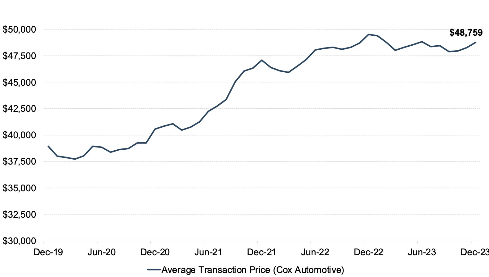 While the average used-vehicle transaction price slightly dipped in December, the average new-vehicle transaction price increased 1.3% from November. The chart below provides context around the monthly average transaction price (per Cox Automotive) from December 2019 to December 2023.