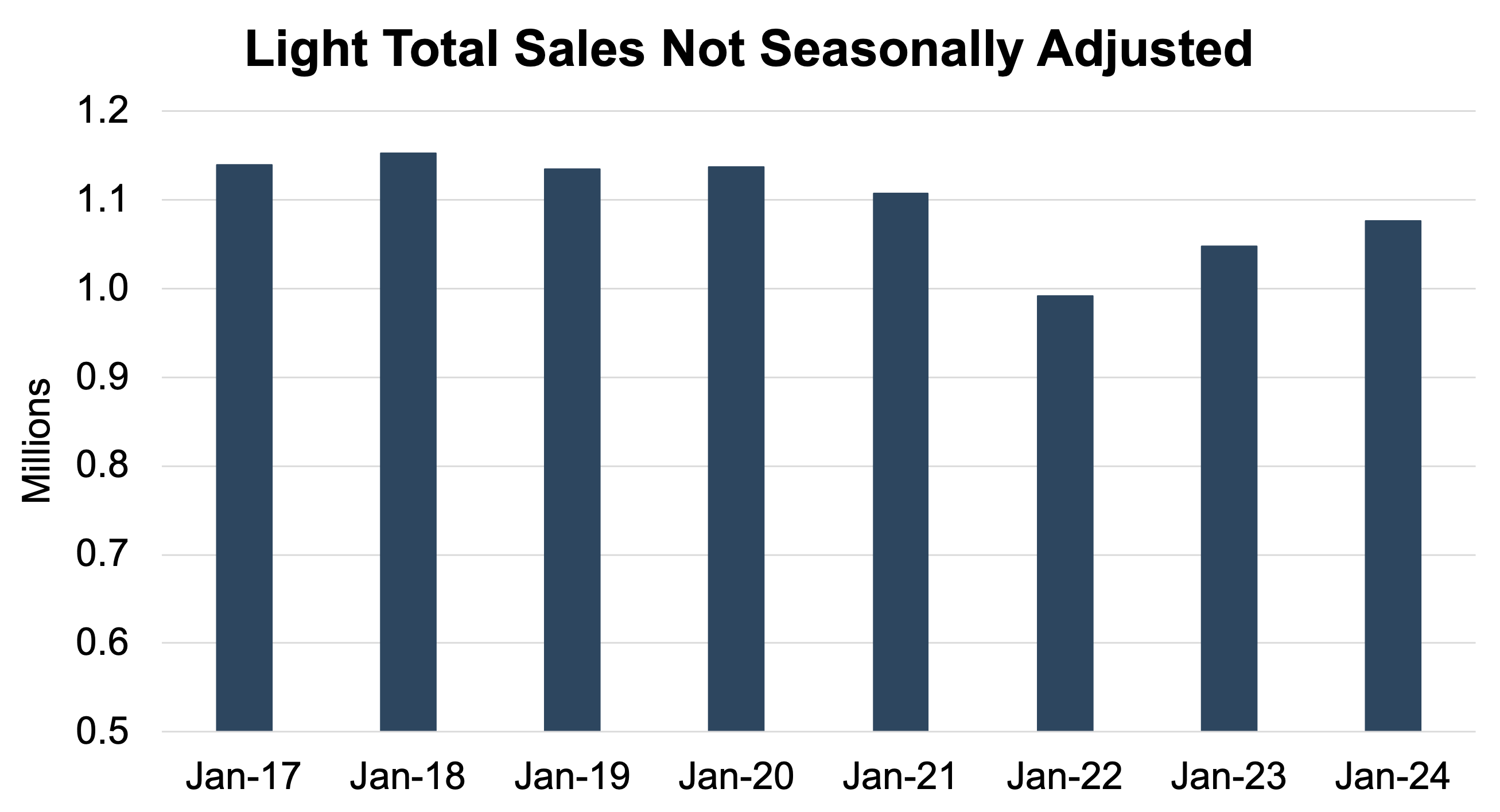 On an unadjusted basis, the industry sold 1.08 million total units in January 2024. From last month, unadjusted sales fell by over 25%. While shocking at first glance, we must note that this decline takes us from December (the highest-selling month) to January (the lowest-selling month); this fall-off is the exact reason the industry tracks volumes on a seasonally adjusted basis. Compared to the last several Januarys, however, this marks the highest January sales since 2021. The chart below shows unadjusted total sales volumes for the last eight Januarys: