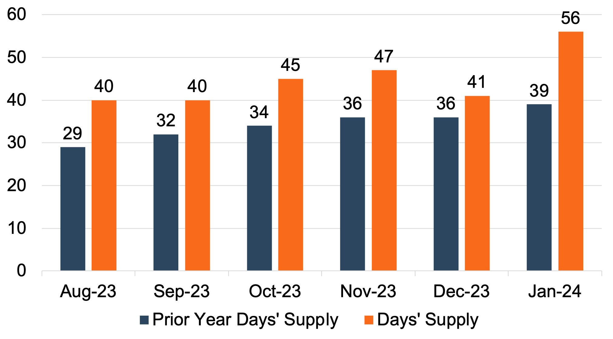 Days’ Supply, another window into the relationship between auto sales and inventory, has generally increased over the last year. In January 2024, Days’ Supply increased to 56 from 41 in December 2023. While there is a chance Days’ Supply will drop below 50 in the coming months, the January level of Days’ Supply, together with the recovering inventory-to-sales ratio, may indicate a return to pre-pandemic inventory levels. The chart below gives a closer look at Days’ Supply for U.S. Light Vehicles over the past six months (per Wards Intelligence):