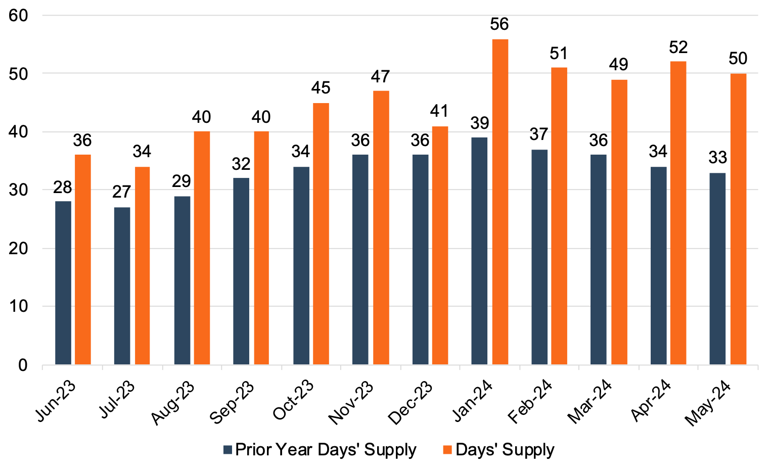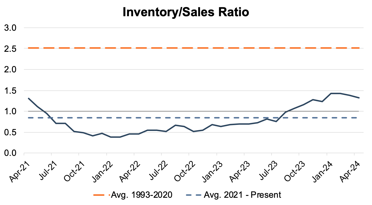 An inventory-to-sales ratio greater than 1.0x indicates that the seasonally adjusted inventory level at the end of the month was greater than reported sales; this data tends to lag by a month or two. In April 2024, the inventory-to-sales ratio dipped slightly to 1.33x from 1.39x in March 2024. April 2024 marks the eighth consecutive month above the 1.0x threshold, suggesting the industry inventory has largely recovered from the lower levels seen throughout the pandemic. The chart below illustrates the industry’s inventory-to-sales ratio over the last three years.