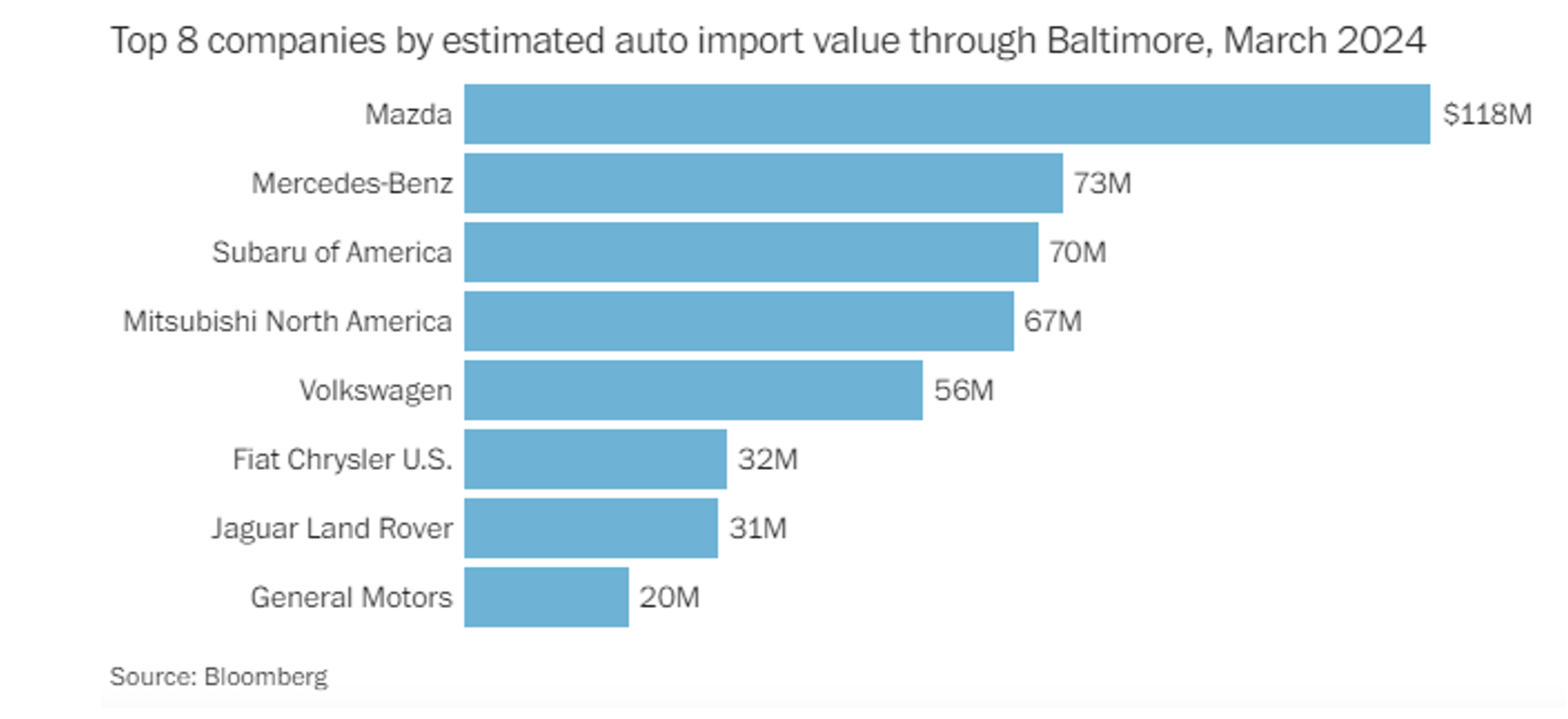 Automobile imports account for nearly 75% of all automobiles passing through the Port of Baltimore. Specifically, a majority of the vehicles are from foreign manufacturers such as Mazda and Mercedes-Benz. The graph below from Bloomberg displays the top eight automobile manufacturers (OEMs) that ship vehicles through the Port of Baltimore through March 2024: