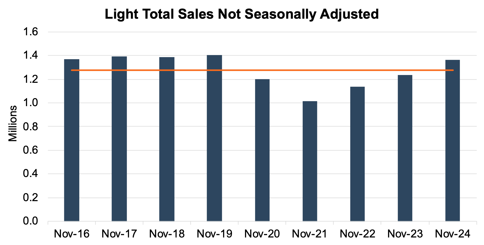 On an unadjusted basis, the industry sold 1.36 million units during November 2024, a 1.3% increase from last month and a 10.1% increase from this time last year. In fact, this month's unadjusted sales landed 83 thousand units above the nine-year November average of 1.28 million units (2016 – 2024). This data underscores the strength of the recovery that has already occurred in the auto dealer industry, with sustained growth solidifying the upward trend over the past year. This month's year-over-year increase highlights how the industry has not only rebounded but is now consistently outperforming historical averages (from a unit perspective) since 2020, reflecting steady consumer demand and improved supply conditions. See the chart below for a look at unadjusted sales over the last nine Novembers: