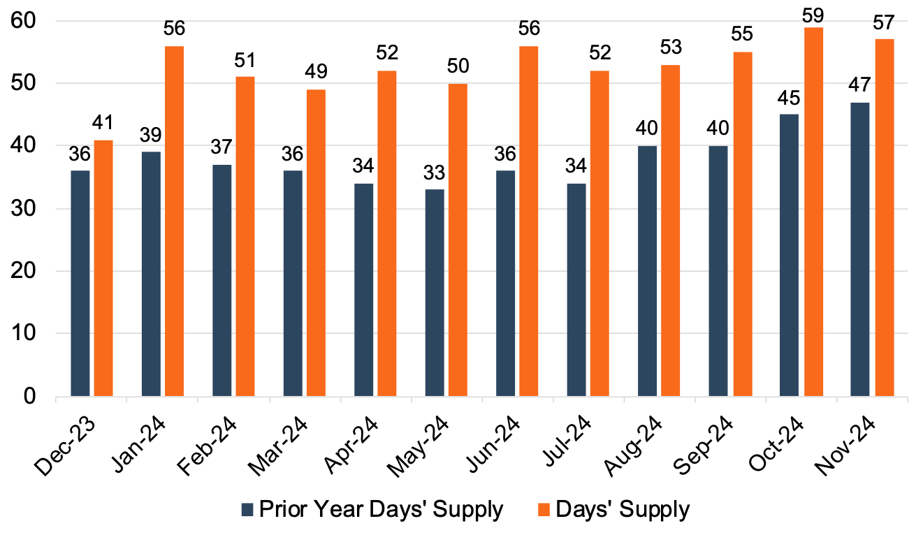Days' supply came in at 57 days in November 2024. Inventory levels throughout 2024 suggest that the global supply chain has largely restored inventory levels since the pandemic. It is important to note that inventory levels vary significantly from brand to brand. The chart below presents days' supply for U.S. light vehicles over the past 24 months (per Wards Intelligence).