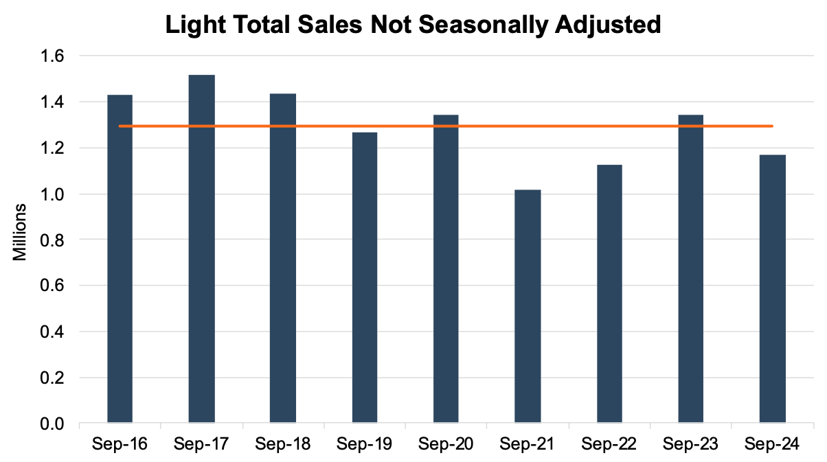 On an unadjusted basis, the industry sold 1.17 million units during September 2024, a 17.9% decrease from last month and a 12.8% decrease from this time last year. The steep declines from both last month and last year may appear alarming but were likely influenced by the Friday and Saturday of Labor Day weekend falling in August instead of September. On a combined, unadjusted basis, August and September 2024 were just 2.5% lower than August and September 2023.