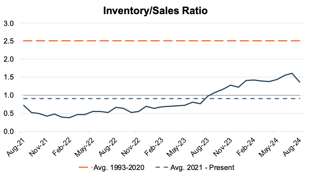 An inventory-to-sales ratio greater than 1.0x indicates that the seasonally adjusted inventory level at the end of the month was greater than reported sales; this data tends to lag by a month or two. In August 2024, the industry’s inventory-to-sales ratio dipped to 1.36x from 1.60x in July 2024. While the month-over-month drop in the inventory-sales ratio appears major, the August metric is in line with pre-cyberattack levels. Looking at the longer-term trends, it is clear that inventories across most brands have been recovered for some time now as dealers are holding more inventory than they are selling in any given month. The chart below illustrates the industry’s inventory-to-sales ratio over the last three years.