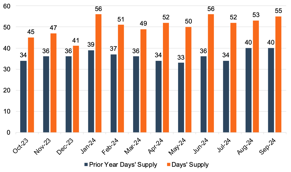 Taking a different look at inventory levels, days’ supply came in at 55 days in September 2024. Compared to days’ supply of 40 in September 2023, we see that the global supply chain has made significant progress in building inventory levels up; however, it is important to note that inventory levels vary greatly from brand to brand. The chart below presents days’ supply for U.S. light vehicles over the past 24 months (per Wards Intelligence).