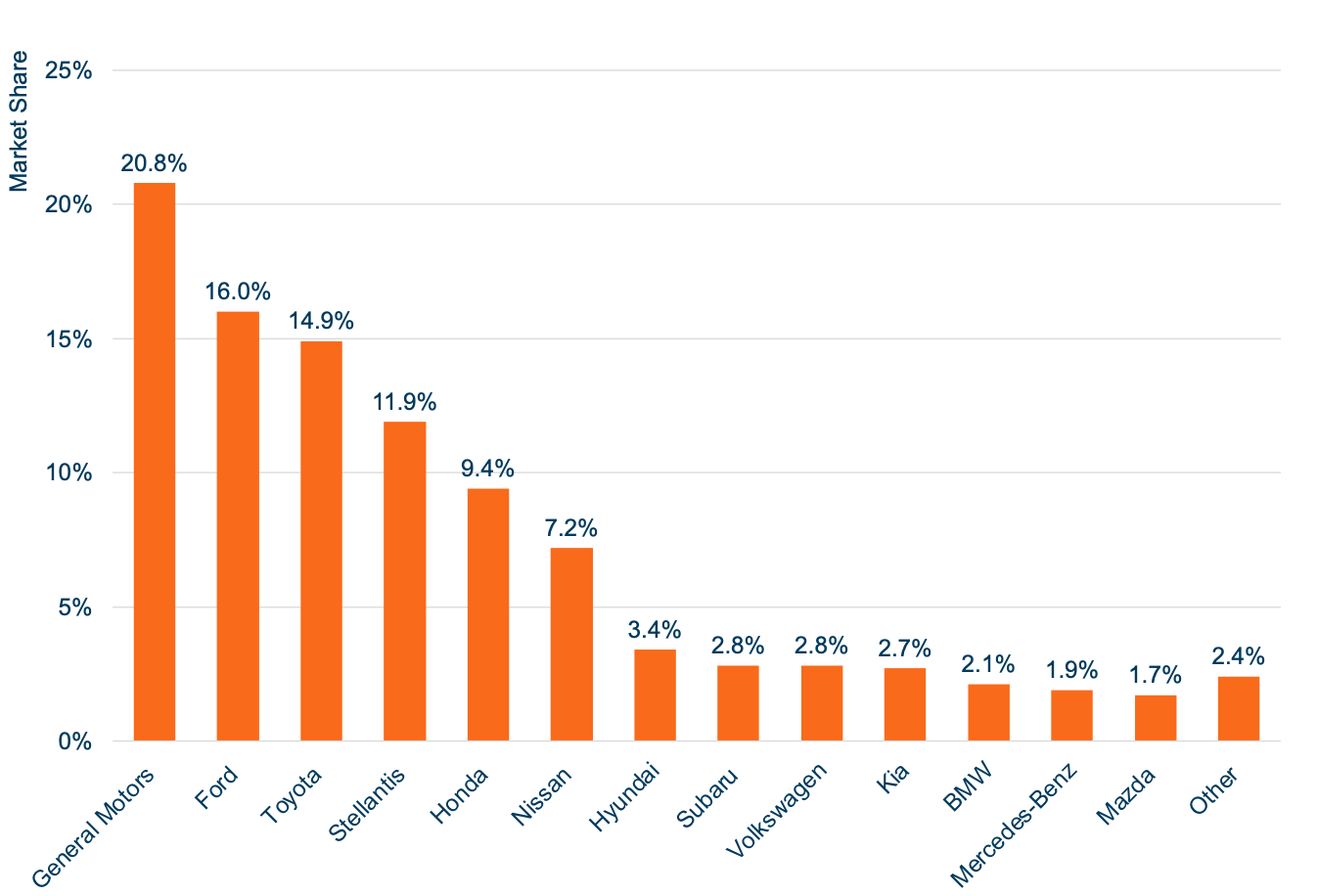These broad vehicle types can be broken down into around 20 vehicle segments. Despite light trucks' position as the least popular vehicle type, the full-size pickup truck segment is the most popular in the United States, representing 16.4% of total VIO. Full-size pickup trucks are followed by midsize cars (13.5%), midsize crossovers (11.7%), and compact cars (7.4%).