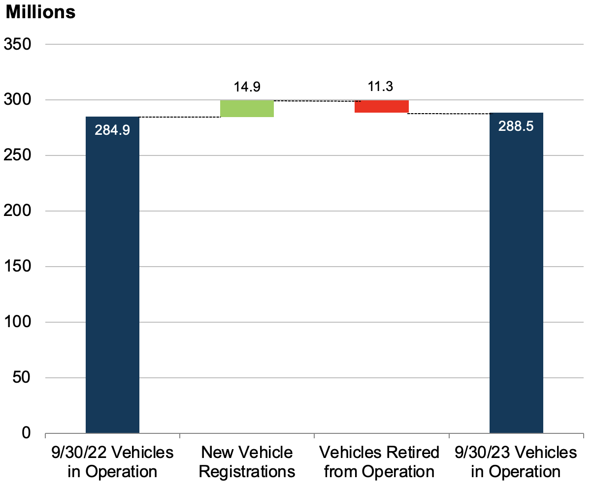 In the U.S. and Canada, light duty vehicles in operation were 288.5 million on September 30, 2023, a positive difference of 3.6 million units or 1.3% higher than the same figure in Q3 2022. The light vehicle VIO changes over the last twelve months are 14.9 million new vehicle registrations minus 11.3 million vehicles taken out of operation. See the chart below for a visualization of the change in VIO over the last year.