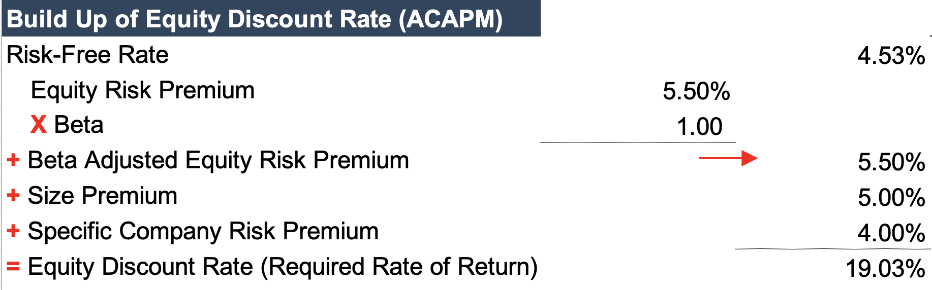 Public Guideline Company Analysis: For auto dealer valuations, public auto retailers do not provide the best estimate for comparable discount and growth rates due to differences in size, growth, geographic diversification, and brand diversification. Specifically, a typical auto dealership valuation is performed for one dealership with one brand in one location — unlike the public retailers. “Build-Up” Analysis: A build-up analysis can be based upon the Capital Asset Pricing Model (CAPM) or Adjusted CAPM (ACAPM) and is typically the most appropriate for auto dealer valuations. This method breaks down the total discount rate into the sum of its components like the risk-free rate, equity risk premium, size premium, and specific-company risk premium. Each of these components is estimated using different methodologies, and a more detailed discussion of these components can be found in this Mercer Capital newsletter. See the chart below for an example of a “build-up” analysis. Of the key assumptions below, generally, the risk-free rate, equity risk premium, beta, and size premium are market-driven and date-specific. Specific Company Risk and Long-Term Growth fall under the professional judgment of the appraiser and rely on their experience in the industry and the specific factors of the subject dealership.